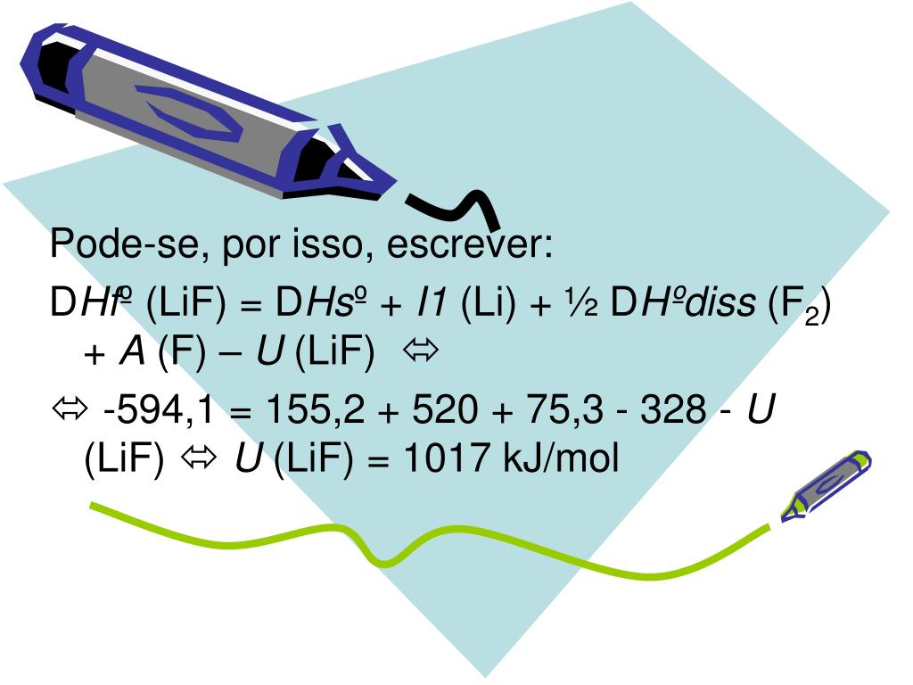 Pode-se, por isso, escrever: DHfº (LiF) = DHsº + I1 (Li) + ½ DHºdiss (F2) + A (F) – U (LiF) -594,1 = 155,2 + 520 + 75,3 - 328 - U (LiF) U (LiF) = 1017 kJ/mol