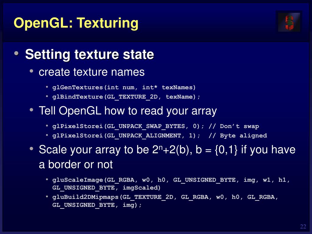 OpenGL: Texturing • Setting texture state (cont) • Tell OpenGL about your data array (image, etc.) • glTexImage2D(GL_TEXTURE_2D, int lod, int num_components, width, height, border, format_of_data_pixel, size_of_each_channel, img_array) • If you used to gluBuild2DMipmaps scale your image and create a multi-resolution pyramid of textures, then you do NOT need to use glTexImage2D. The gluBuild2DMipmaps command will already tell OpenGL about your array.
