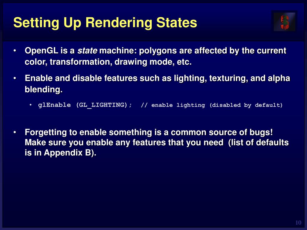 Setting Up Rendering States • OpenGL is a state machine: polygons are affected by the current color, transformation, drawing mode, etc. • Enable and disable features such as lighting, texturing, and alpha blending. • glEnable (GL_LIGHTING); // enable lighting (disabled by default) • Forgetting to enable something is a common source of bugs! Make sure you enable any features that you need (list of defaults is in Appendix B).