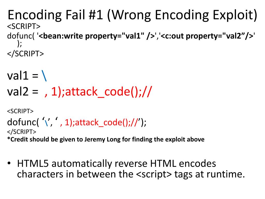 Encoding Fail #1 (Wrong Encoding) <SCRIPT> dofunc('<bean:write property="val1"/>','<c:out property="val2"/>’); </SCRIPT> <!DOCTYPE html> <HTML><BODY><script> <bean:write property=“${param.script}" /> </script></BODY></HTML> ', ", <, >, & ', ", <, >, & ', ", <, >, &