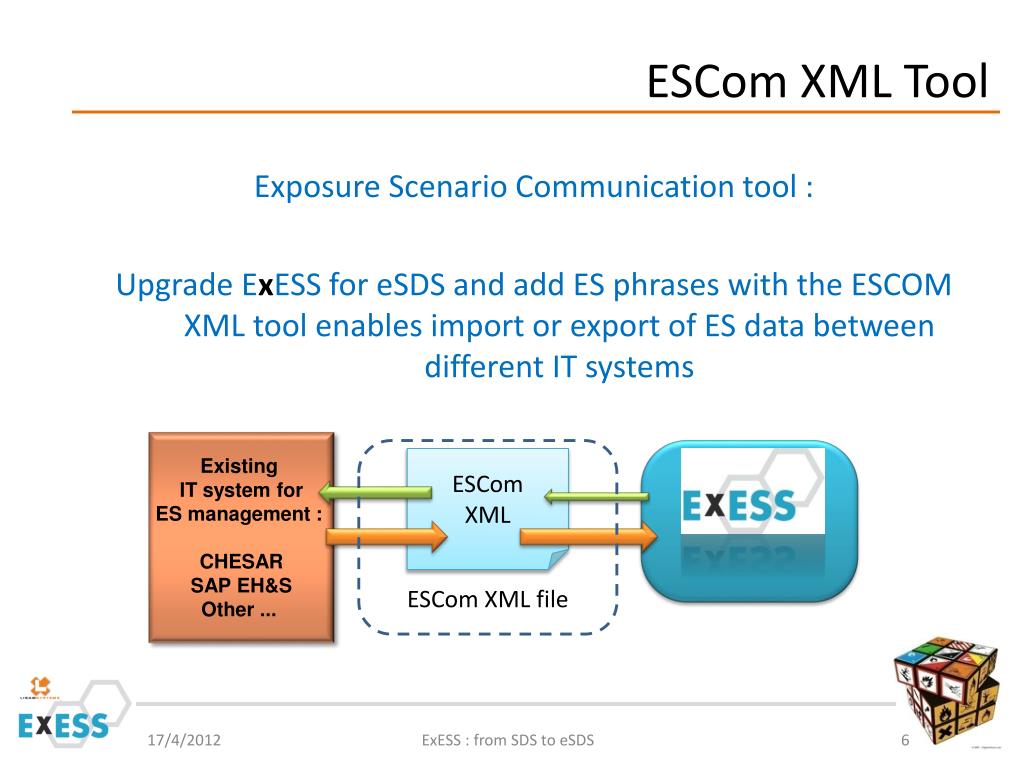ESCom XML Tool Exposure Scenario Communication tool : Upgrade ExESS for eSDS and add ES phrases with the ESCOM XML tool enables import or export of ES data between different IT systems Existing IT system for ES management : CHESAR SAP EH&S Other ... ESCom XML file ESCom XML ExESS : from SDS to eSDS