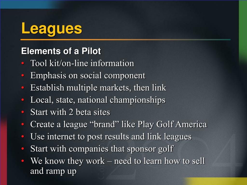Leagues Elements of a Pilot • Tool kit/on-line information • Emphasis on social component • Establish multiple markets, then link • Local, state, national championships • Start with 2 beta sites • Create a league “brand” like Play Golf America • Use internet to post results and link leagues • Start with companies that sponsor golf • We know they work – need to learn how to sell and ramp up