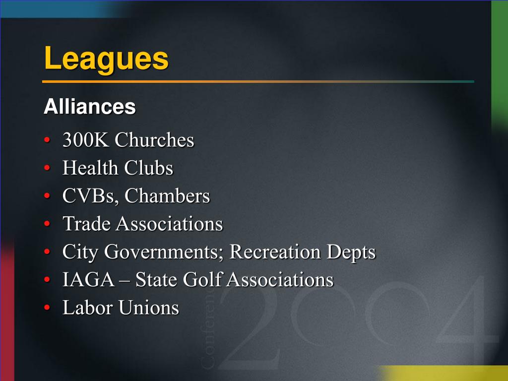 Leagues Alliances • 300K Churches • Health Clubs • CVBs, Chambers • Trade Associations • City Governments; Recreation Depts • IAGA – State Golf Associations • Labor Unions