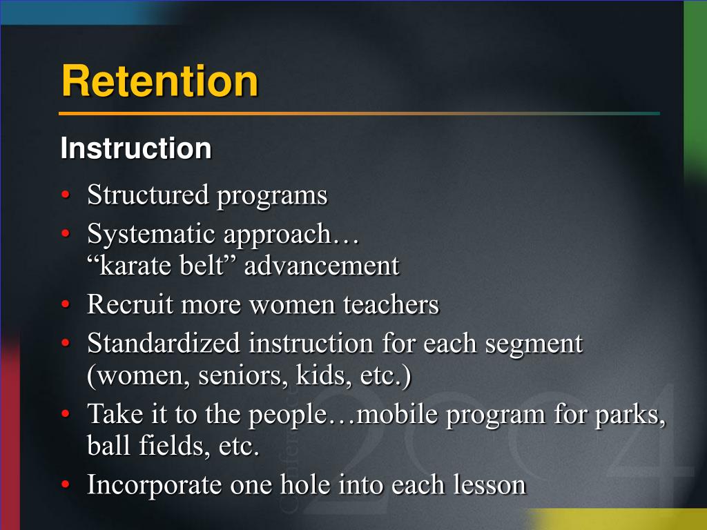 Retention Instruction • Structured programs • Systematic approach… “karate belt” advancement • Recruit more women teachers • Standardized instruction for each segment (women, seniors, kids, etc.) • Take it to the people…mobile program for parks, ball fields, etc. • Incorporate one hole into each lesson