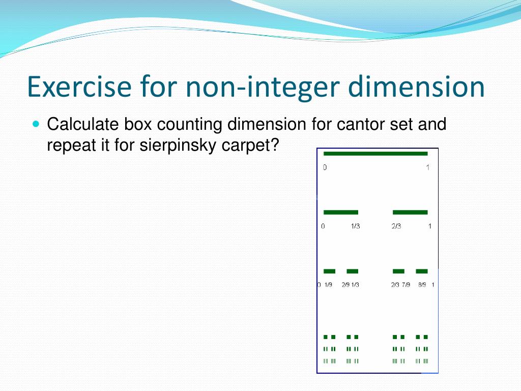 Exercise for non-integer dimension • Calculate box counting dimension for cantor set and repeat it for sierpinsky carpet?