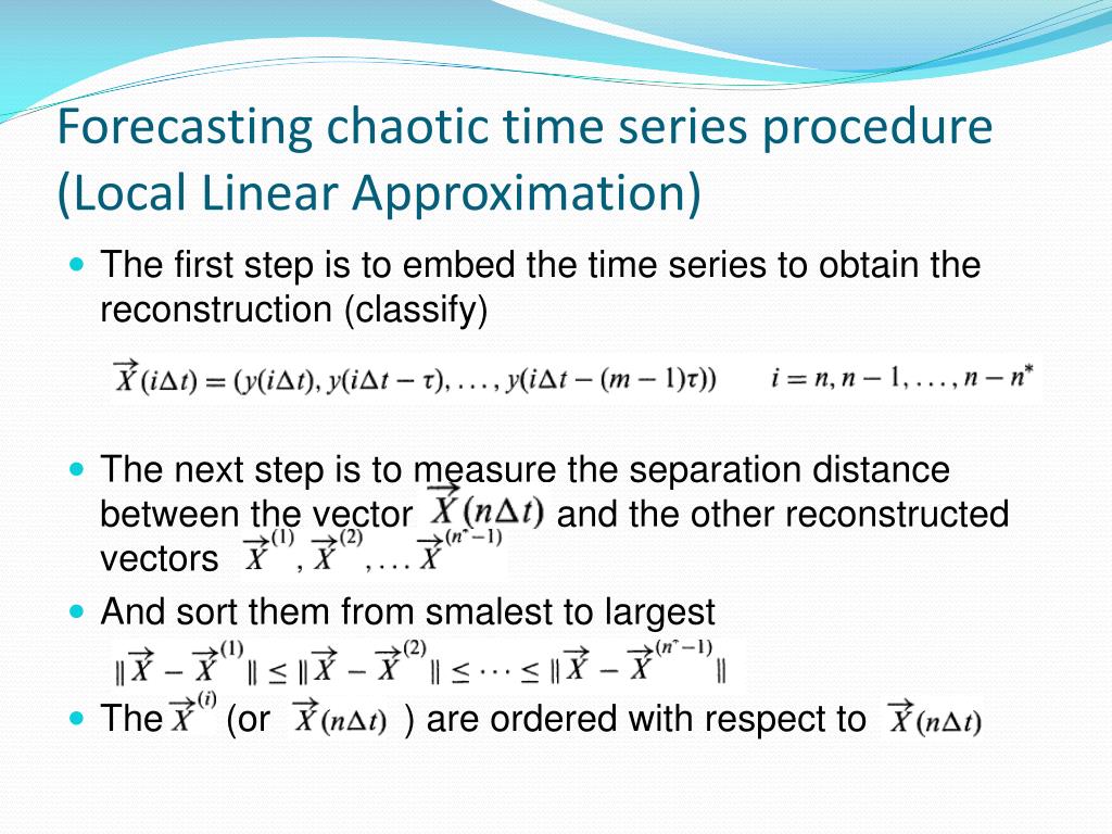 Forecasting chaotic time series procedure (Local Linear Approximation) • The first step is to embed the time series to obtain the reconstruction (classify) • The next step is to measure the separation distance between the vector and the other reconstructed vectors • And sort them from smalest to largest • The (or ) are ordered with respect to