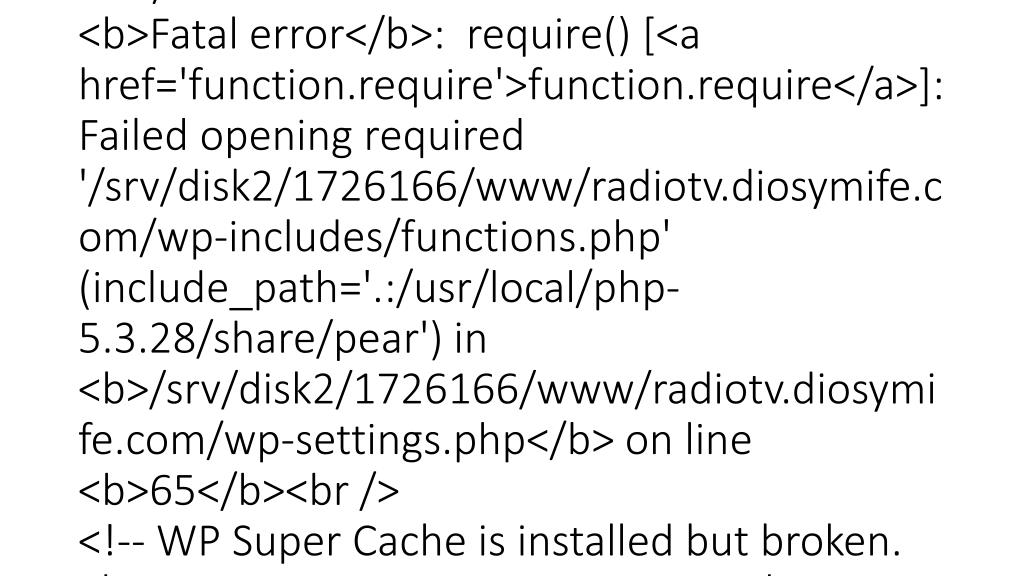 <br /> <b>Warning</b>: require(/srv/disk2/1726166/www/radiotv.diosymife.com/wp-includes/functions.php) [<a href='function.require'>function.require</a>]: failed to open stream: No such file or directory in <b>/srv/disk2/1726166/www/radiotv.diosymife.com/wp-settings.php</b> on line <b>65</b><br /> <br /> <b>Fatal error</b>: require() [<a href='function.require'>function.require</a>]: Failed opening required '/srv/disk2/1726166/www/radiotv.diosymife.com/wp-includes/functions.php' (include_path='.:/usr/local/php-5.3.28/share/pear') in <b>/srv/disk2/1726166/www/radiotv.diosymife.com/wp-settings.php</b> on line <b>65</b><br /> <!-- WP Super Cache is installed but broken. The constant WPCACHEHOME must be set in the file wp-config.php and point at the WP Super Cache plugin directory. -->