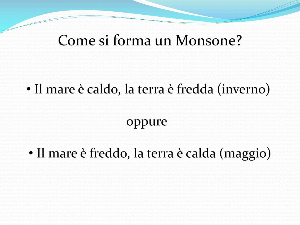 Vento ciclico, caldo e tipico dell‘Oceano Indiano • Importante per il clima • Meteorologi lo chiamano vento periodico • In Maggio e Ottobre • Accompagnato da cicloni tropicali e tifoni • Sono molto violenti