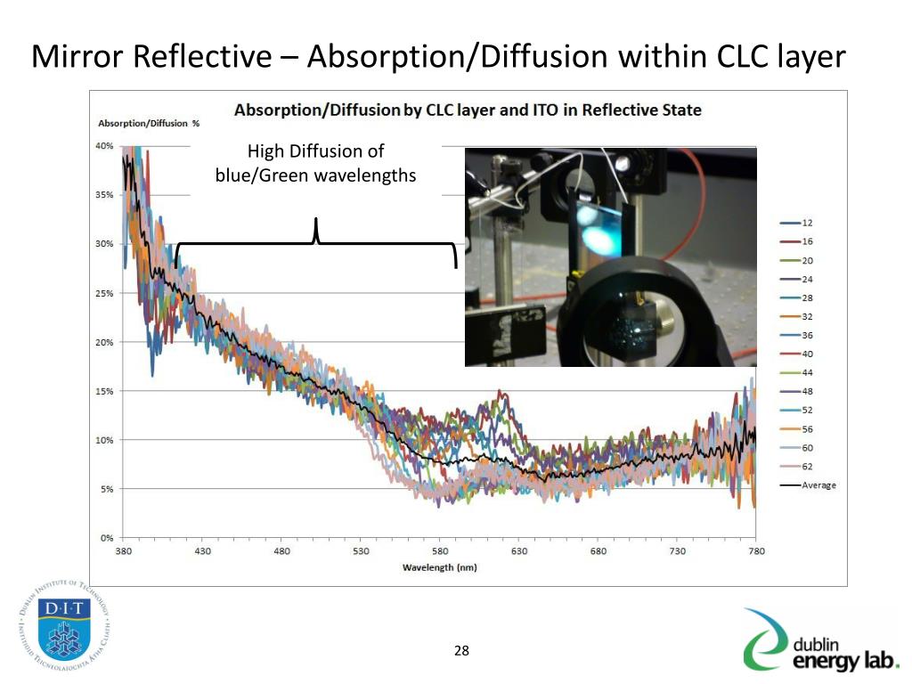 Mirror Clear – Absorption/Diffusion within CLC layer Symmetrical diffusion in blue and red wavelengths. Effect of the film structure rather than only the material??