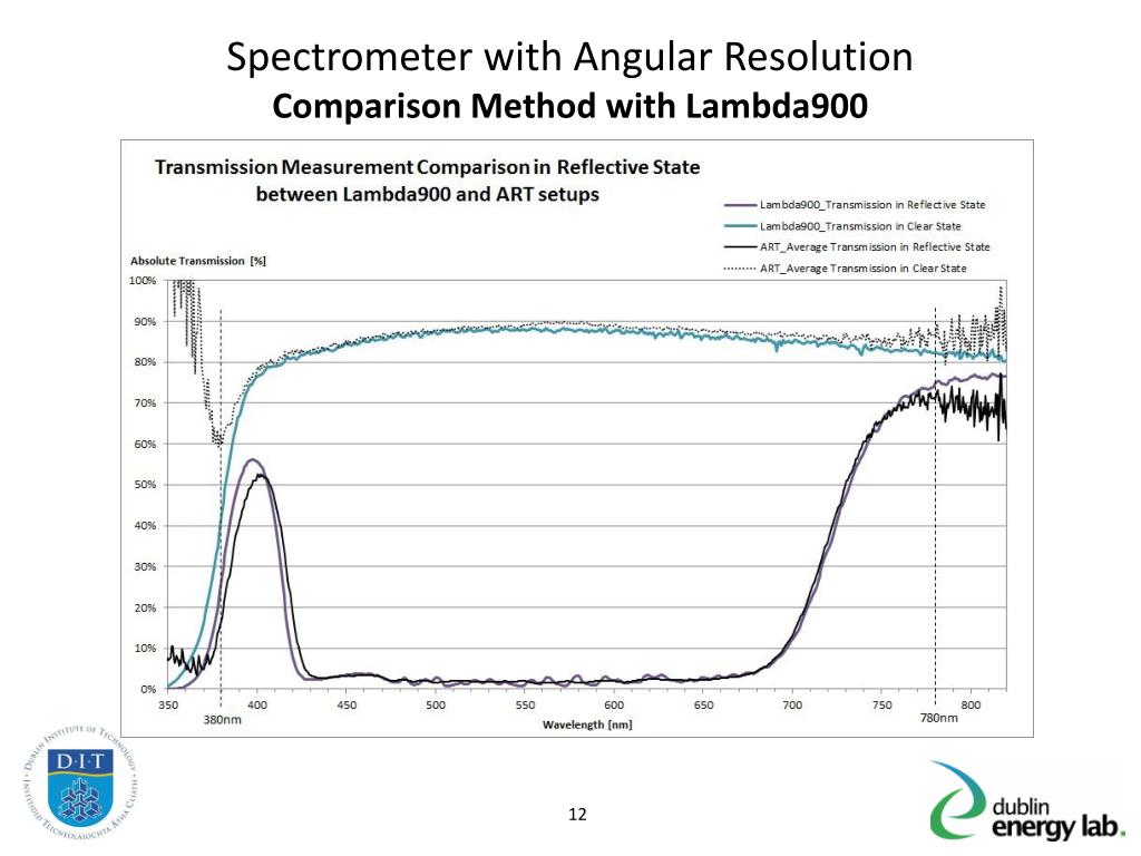 Setups Lambda900 spectrophotometer Measure spectral Transmission UV to NIR. Normal light incidence angle with mirror Clear and Reflective at Sample port and Integrating Sphere port. Scanning time of visible range: ~1min At T=10% accuracy of ± 0.08% At T=35% accuracy of ± 0.05% Results used as a reference for comparison with the second setup. Spectrophotometer with Angular Resolution Switchable Mirror Rotational Stage: Varies light incidence angle on mirror. Detector Rotational Stage: Rotate independently of ‘mirror stage’ collecting all light reflected by or transmitted through the mirror. Spectrometer A: Detector for spectral reflection and transmission. Spectrometer B: Detector for source fluctuation detection Angular accuracy: 1 degree Scanning time of visible range: millisecond Transmission/Reflection accuracy unknown at this stage Using lambda900 results as reference
