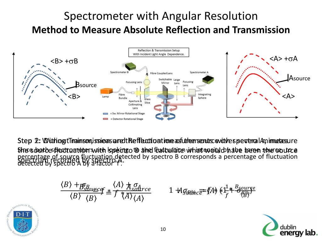 Spectrometer with Angular ResolutionMethod to Measure Absolute Reflection and Transmission <A> +sA <B> +sB Asource Bsource <A> <B> Step 1: Without mirror, measure the fluctuation of the source over several minutes Since both spectrometers are looking to the fluctuation in intensity by the same source, to a percentage of source fluctuation detected by spectro B corresponds a percentage of fluctuation detected by spectro A by a factor ‘f’. ) Step 2: During Transmission and Reflection measurements with spectro A, measure the source fluctuation with spectro B and calculate what would have been the source spectrum recorded by spectro A. =*
