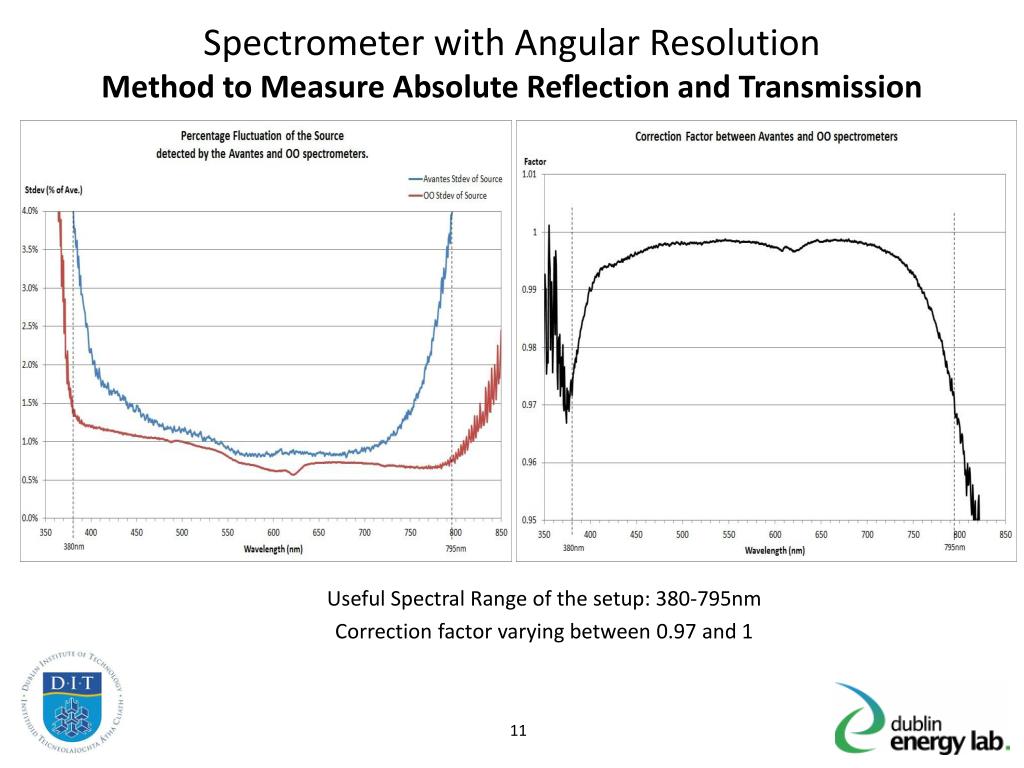 Spectrometer with Angular ResolutionMethod to Measure Absolute Reflection and Transmission Useful Spectral Range of the setup: 380-795nm Correction factor varying between 0.97 and 1