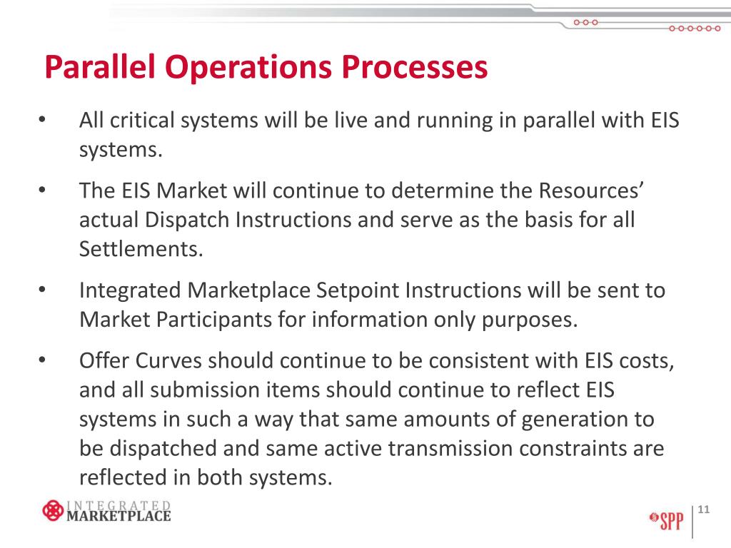 Parallel Operations Processes • All critical systems will be live and running in parallel with EIS systems. • The EIS Market will continue to determine the Resources’ actual Dispatch Instructions and serve as the basis for all Settlements. • Integrated Marketplace Setpoint Instructions will be sent to Market Participants for information only purposes. • Offer Curves should continue to be consistent with EIS costs, and all submission items should continue to reflect EIS systems in such a way that same amounts of generation to be dispatched and same active transmission constraints are reflected in both systems.