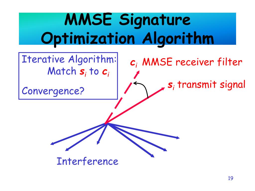 MMSE Signature Optimization Algorithm Iterative Algorithm: Matchsito ci Convergence? ci MMSE receiver filter si transmit signal Interference