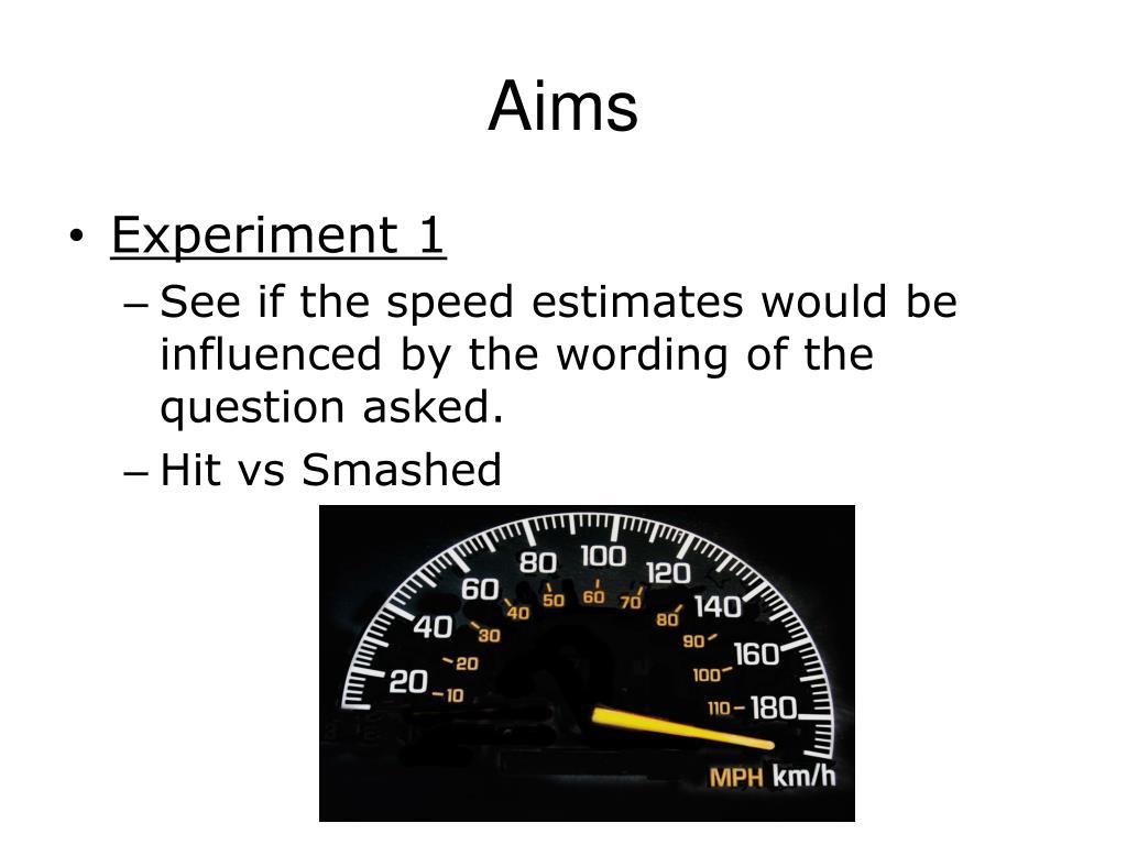 Aims • Loftus and Palmer’s experiment was actually two experiments. • They wanted to investigate in general how accurate or inaccurate memory was. Specifically they wanted to see the effect of leading questions upon estimates of speed.
