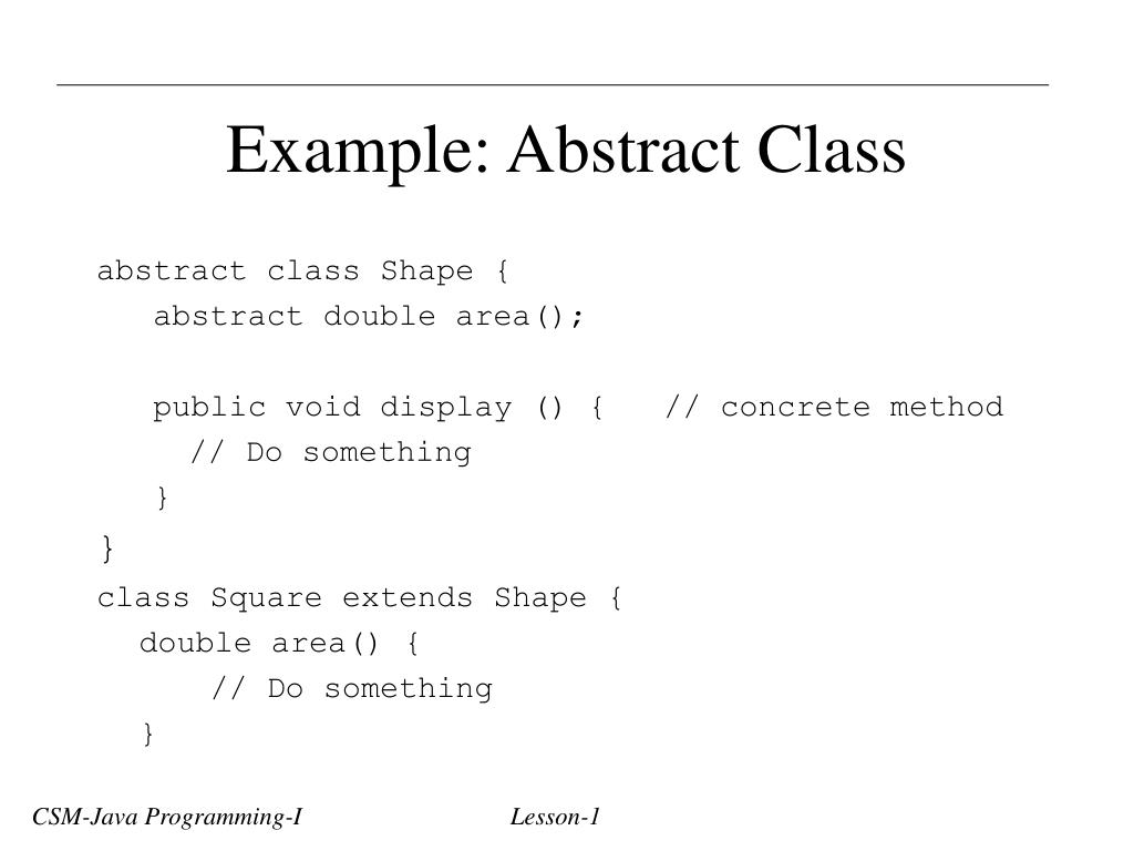 Example: Abstract Class abstract class Shape { abstract double area(); public void display () { // concrete method // Do something } } class Square extends Shape { double area() { // Do something } CSM-Java Programming-I Lesson-1