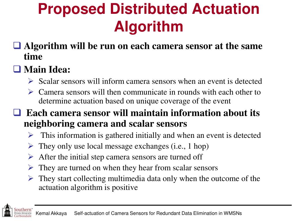 Department of Computer Science Southern Illinois University Carbondale Self-actuation of Camera Sensors for Redundant Data Elimination in Wireless Multimedia Sensor Networks Andrew Newell & Kemal Akkaya Self-actuation of Camera Sensors for Redundant Data Elimination in WMSNs