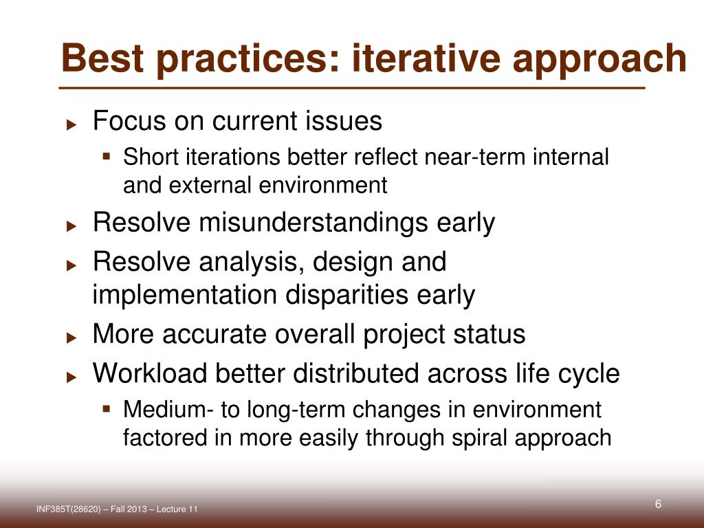 Best practices: iterative approach • Focus on current issues • Short iterations better reflect near-term internal and external environment • Resolve misunderstandings early • Resolve analysis, design and implementation disparities early • More accurate overall project status • Workload better distributed across life cycle • Medium- to long-term changes in environment factored in more easily through spiral approach INF385T(28620) – Fall 2013 – Lecture 11