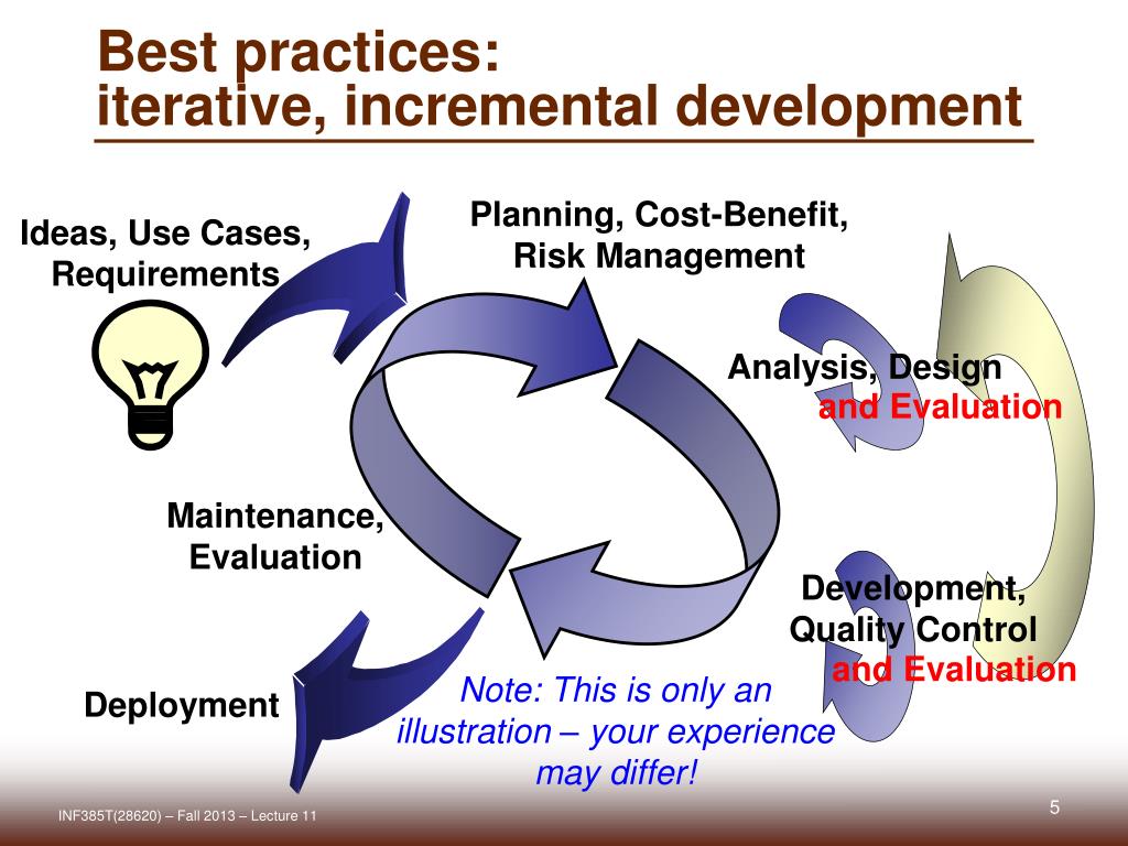 Best practices: iterative, incremental development Planning, Cost-Benefit, Risk Management Ideas, Use Cases, Requirements Analysis, Design and Evaluation Maintenance, Evaluation Development, Quality Control and Evaluation Note: This is only an illustration – your experience may differ! Deployment INF385T(28620) – Fall 2013 – Lecture 11