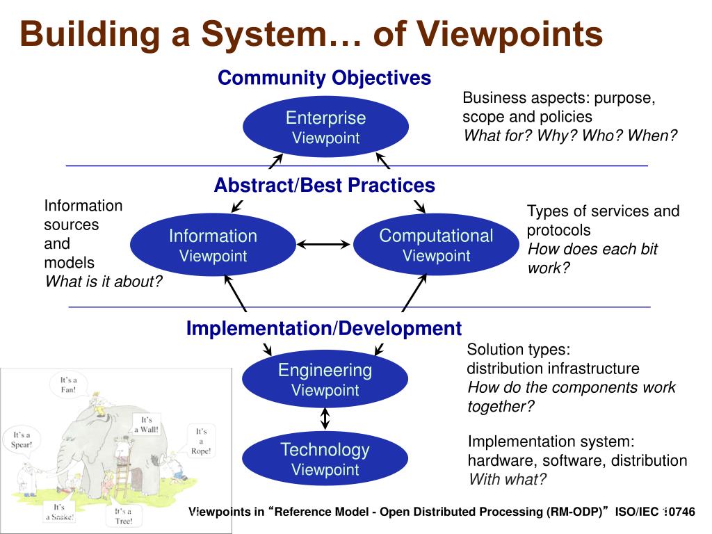 Building a System… of Viewpoints Community Objectives Business aspects: purpose, scope and policiesWhat for? Why? Who? When? Enterprise Viewpoint Abstract/Best Practices Information sources and models What is it about? Types of services and protocols How does each bit work? Information Viewpoint Computational Viewpoint Implementation/Development Solution types: distribution infrastructureHow do the components work together? Engineering Viewpoint Implementation system: hardware, software, distribution With what? Technology Viewpoint INF385T(28620) – Fall 2013 – Lecture 11 Viewpoints in “Reference Model - Open Distributed Processing (RM-ODP)” ISO/IEC 10746