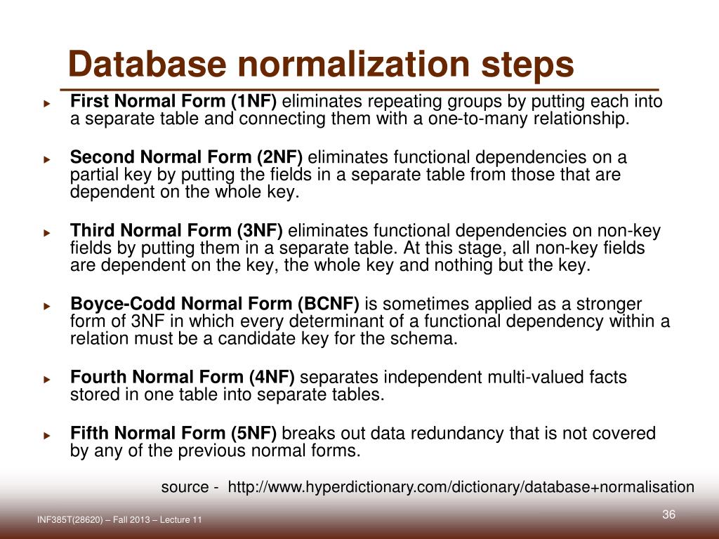 Database normalization steps • First Normal Form (1NF) eliminates repeating groups by putting each into a separate table and connecting them with a one-to-many relationship. • Second Normal Form (2NF) eliminates functional dependencies on a partial key by putting the fields in a separate table from those that are dependent on the whole key. • Third Normal Form (3NF) eliminates functional dependencies on non-key fields by putting them in a separate table. At this stage, all non-key fields are dependent on the key, the whole key and nothing but the key. • Boyce-Codd Normal Form (BCNF) is sometimes applied as a stronger form of 3NF in which every determinant of a functional dependency within a relation must be a candidate key for the schema. • Fourth Normal Form (4NF) separates independent multi-valued facts stored in one table into separate tables. • Fifth Normal Form (5NF) breaks out data redundancy that is not covered by any of the previous normal forms. source - http://www.hyperdictionary.com/dictionary/database+normalisation INF385T(28620) – Fall 2013 – Lecture 11