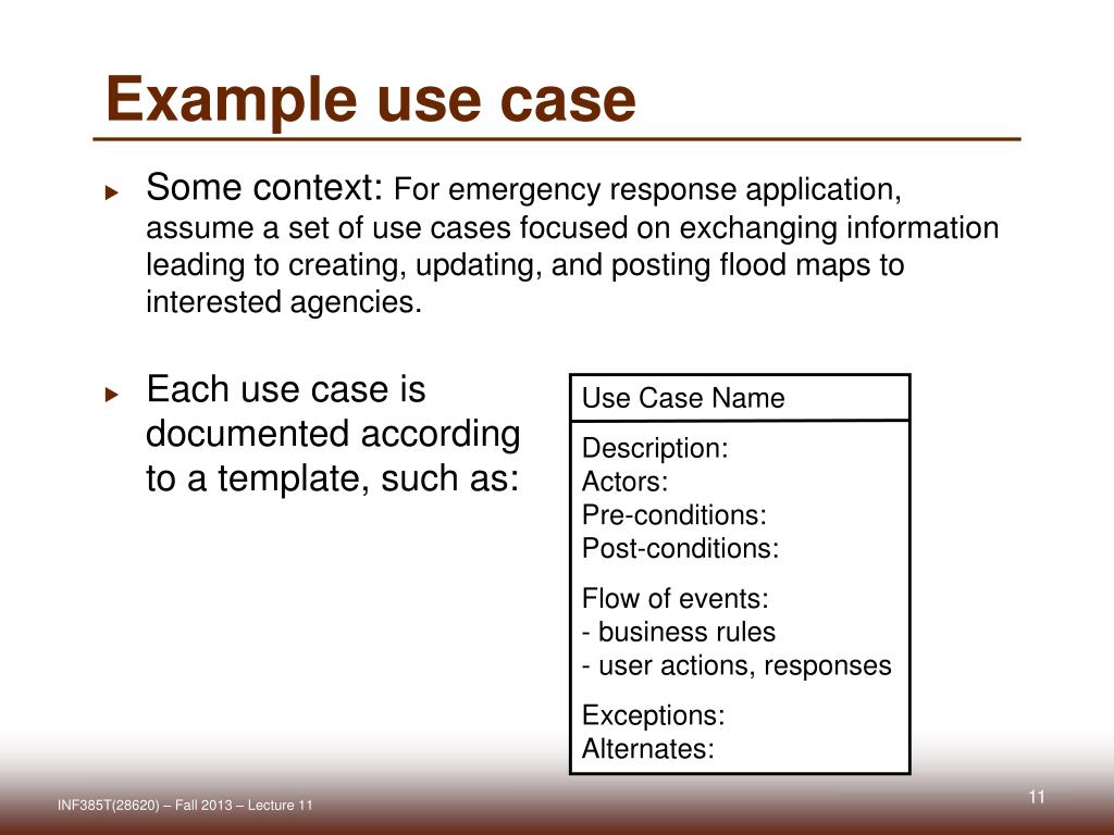 Use Case Name Description:Actors:Pre-conditions:Post-conditions: Flow of events:- business rules- user actions, responses Exceptions:Alternates: Example use case • Some context: For emergency response application, assume a set of use cases focused on exchanging information leading to creating, updating, and posting flood maps to interested agencies. • Each use case is documented according to a template, such as: INF385T(28620) – Fall 2013 – Lecture 11