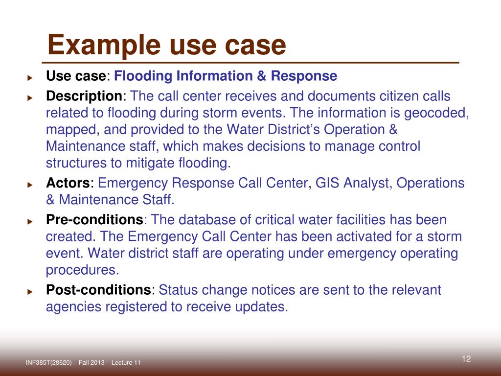 Example use case • Use case: Flooding Information & Response • Description: The call center receives and documents citizen calls related to flooding during storm events. The information is geocoded, mapped, and provided to the Water District’s Operation & Maintenance staff, which makes decisions to manage control structures to mitigate flooding. • Actors: Emergency Response Call Center, GIS Analyst, Operations & Maintenance Staff. • Pre-conditions: The database of critical water facilities has been created. The Emergency Call Center has been activated for a storm event. Water district staff are operating under emergency operating procedures. • Post-conditions: Status change notices are sent to the relevant agencies registered to receive updates. INF385T(28620) – Fall 2013 – Lecture 11