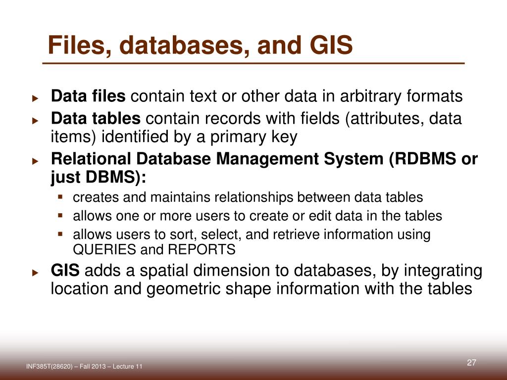Files, databases, and GIS • Data files contain text or other data in arbitrary formats • Data tables contain records with fields (attributes, data items) identified by a primary key • Relational Database Management System (RDBMS or just DBMS): • creates and maintains relationships between data tables • allows one or more users to create or edit data in the tables • allows users to sort, select, and retrieve information using QUERIES and REPORTS • GIS adds a spatial dimension to databases, by integrating location and geometric shape information with the tables INF385T(28620) – Fall 2013 – Lecture 11