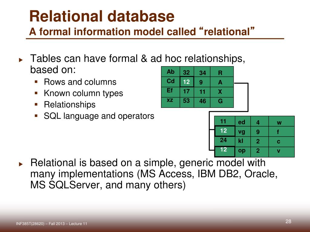 Ab Cd Ef xz 11 12 24 12 32 12 17 53 ed vg kl op 34 9 11 46 4 9 2 2 R A X G w f c v Relational databaseA formal information model called “relational” • Tables can have formal & ad hoc relationships, based on: • Rows and columns • Known column types • Relationships • SQL language and operators • Relational is based on a simple, generic model with many implementations (MS Access, IBM DB2, Oracle, MS SQLServer, and many others) INF385T(28620) – Fall 2013 – Lecture 11