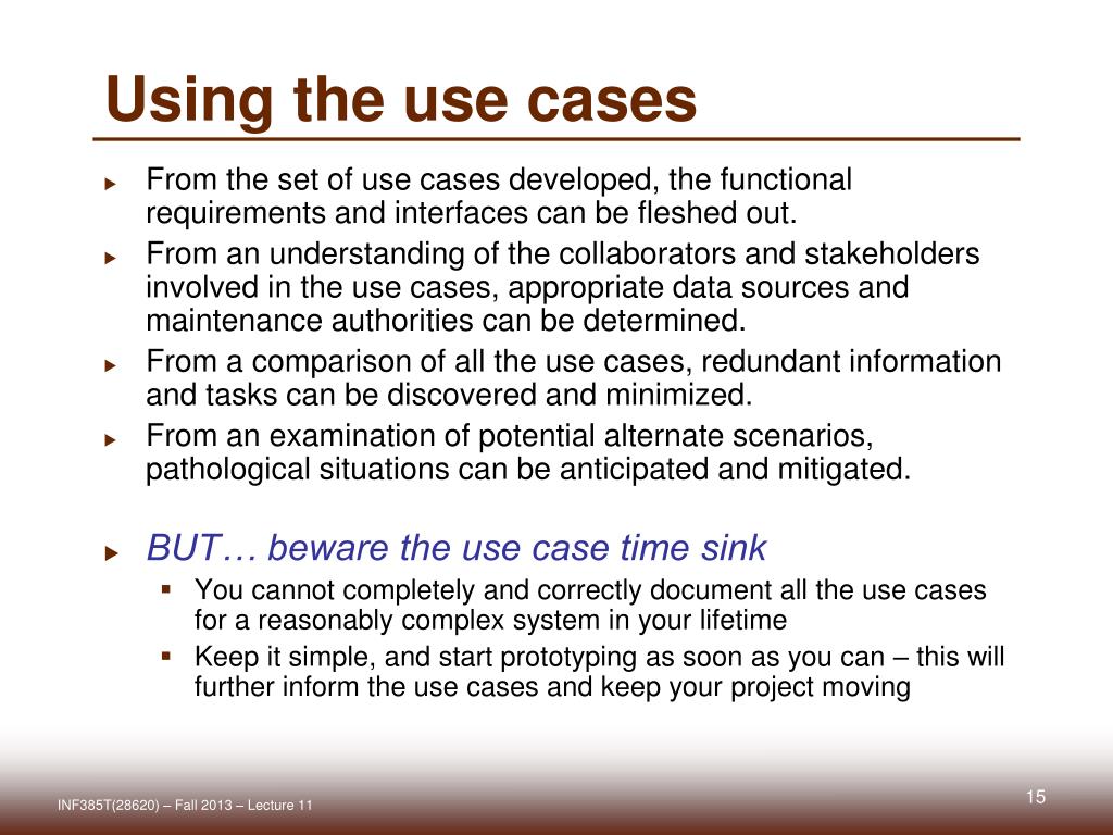 Using the use cases • From the set of use cases developed, the functional requirements and interfaces can be fleshed out. • From an understanding of the collaborators and stakeholders involved in the use cases, appropriate data sources and maintenance authorities can be determined. • From a comparison of all the use cases, redundant information and tasks can be discovered and minimized. • From an examination of potential alternate scenarios, pathological situations can be anticipated and mitigated. • BUT… beware the use case time sink • You cannot completely and correctly document all the use cases for a reasonably complex system in your lifetime • Keep it simple, and start prototyping as soon as you can – this will further inform the use cases and keep your project moving INF385T(28620) – Fall 2013 – Lecture 11