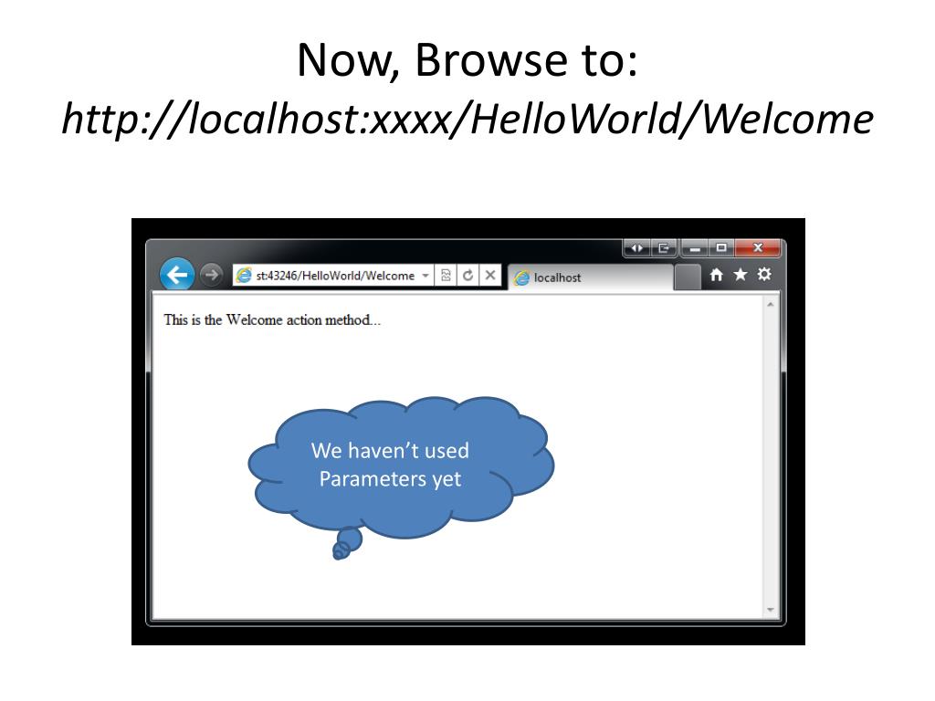 Now, Browse to:http://localhost:xxxx/HelloWorld/Welcome We haven’t used Parameters yet