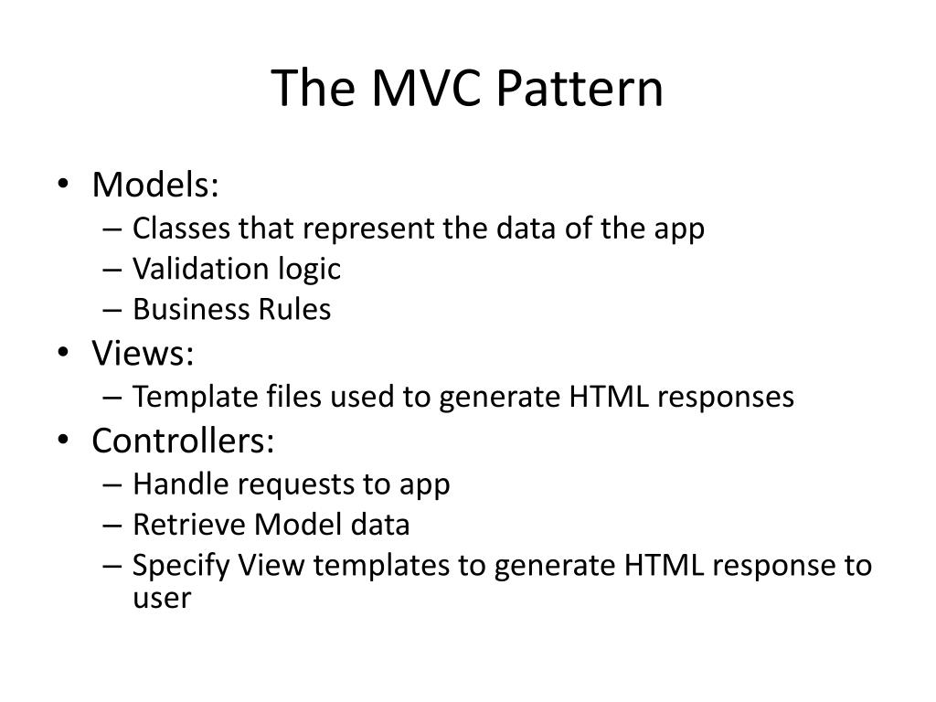 The MVC Pattern • Models: • Classes that represent the data of the app • Validation logic • Business Rules • Views: • Template files used to generate HTML responses • Controllers: • Handle requests to app • Retrieve Model data • Specify View templates to generate HTML response to user