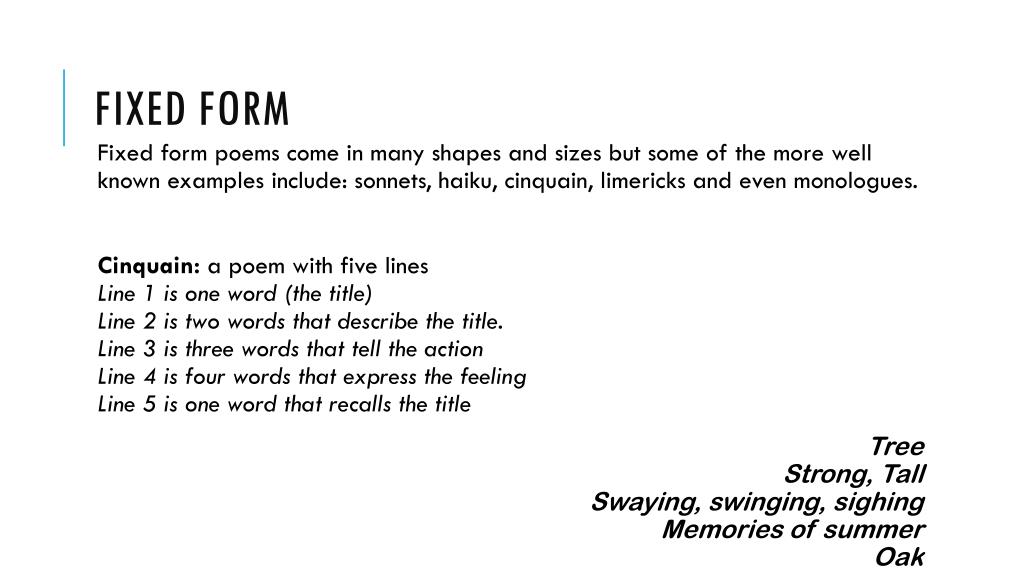 Fixed form • Fixed form poems come in many shapes and sizes but some of the more well known examples include: sonnets, haiku, cinquain, limericks and even monologues. • Cinquain: a poem with five linesLine 1 is one word (the title)Line 2 is two words that describe the title.Line 3 is three words that tell the actionLine 4 is four words that express the feelingLine 5 is one word that recalls the title • TreeStrong, TallSwaying, swinging, sighingMemories of summerOak