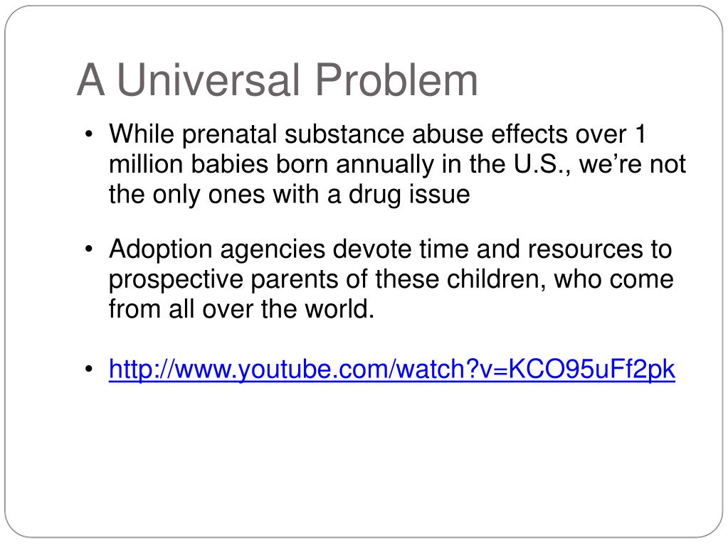 While prenatal substance abuse effects over 1 million babies born annually in the U.S., we’re not the only ones with a drug issue • Adoption agencies devote time and resources to prospective parents of these children, who come from all over the world. • http://www.youtube.com/watch?v=KCO95uFf2pk A Universal Problem