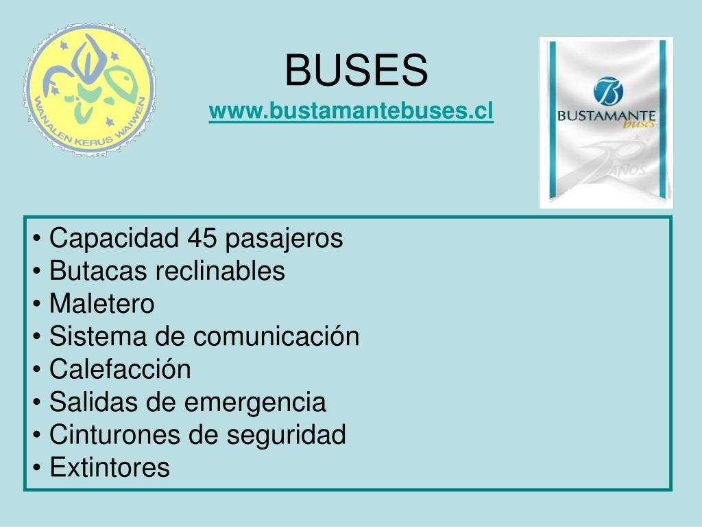 BUSES www.bustamantebuses.cl • Capacidad 45 pasajeros • Butacas reclinables • Maletero • Sistema de comunicación • Calefacción • Salidas de emergencia • Cinturones de seguridad • Extintores
