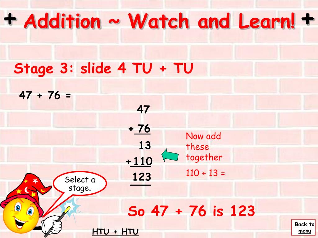 +Addition~Watch and Learn!+ Stage 3: slide 4 TU + TU 47 + 76 = 47 +76 Now add these together 110 + 13 = 13 + 110 123 Select a stage. So 47 + 76 is 123 HTU + HTU
