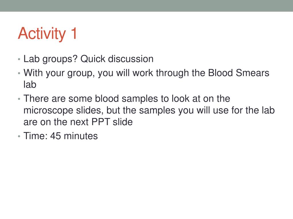 Activity 1 • Lab groups? Quick discussion • With your group, you will work through the Blood Smears lab • There are some blood samples to look at on the microscope slides, but the samples you will use for the lab are on the next PPT slide • Time: 45 minutes