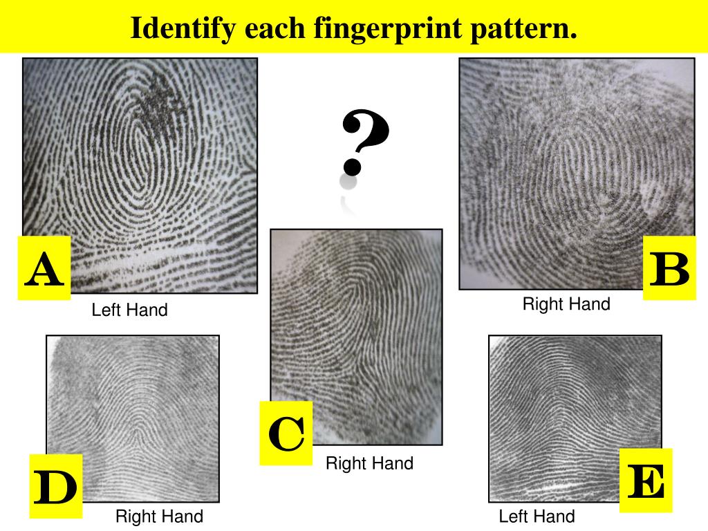 Identify each fingerprint pattern. ? A B Right Hand Left Hand C Right Hand E D Right Hand Left Hand