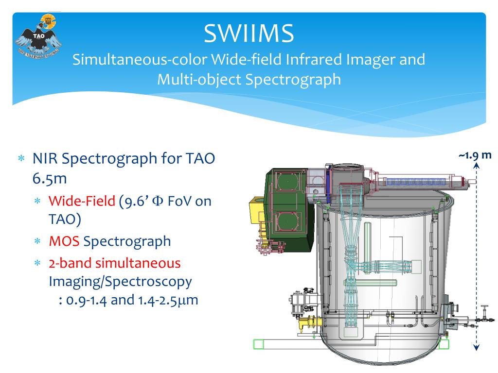 SWIIMS Simultaneous-color Wide-field Infrared Imager and Multi-object Spectrograph ~1.9 m • NIR Spectrograph for TAO 6.5m • Wide-Field (9.6’ F FoV on TAO) • MOS Spectrograph • 2-band simultaneous Imaging/Spectroscopy: 0.9-1.4 and 1.4-2.5mm