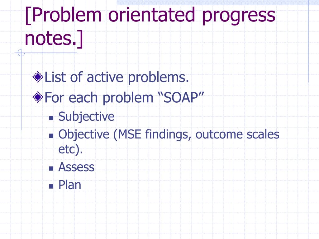 [Problem orientated progress notes.] • List of active problems. • For each problem “SOAP” • Subjective • Objective (MSE findings, outcome scales etc). • Assess • Plan