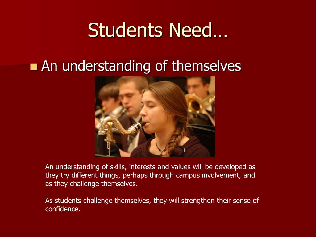 Students Need… • An understanding of themselves An understanding of skills, interests and values will be developed as they try different things, perhaps through campus involvement, and as they challenge themselves. As students challenge themselves, they will strengthen their sense of confidence.