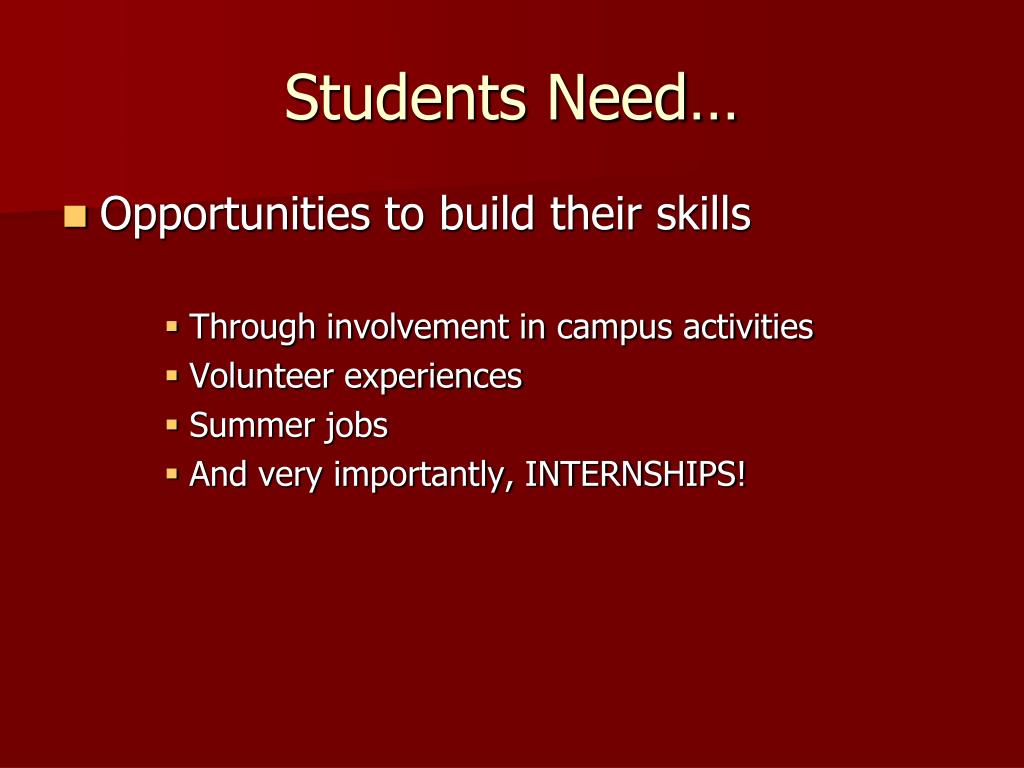 Students Need… • Opportunities to build their skills • Through involvement in campus activities • Volunteer experiences • Summer jobs • And very importantly, INTERNSHIPS!