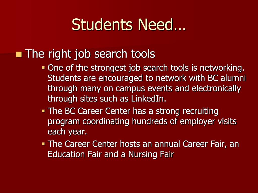 Students Need… • The right job search tools • One of the strongest job search tools is networking. Students are encouraged to network with BC alumni through many on campus events and electronically through sites such as LinkedIn. • The BC Career Center has a strong recruiting program coordinating hundreds of employer visits each year. • The Career Center hosts an annual Career Fair, an Education Fair and a Nursing Fair