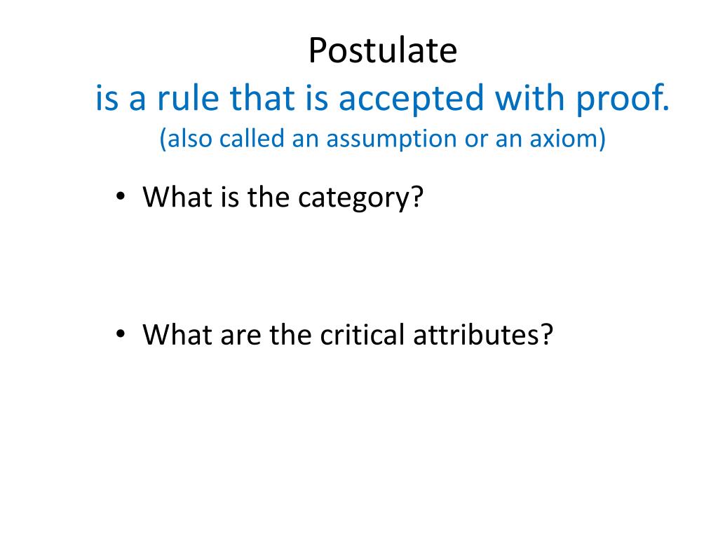 Postulateis a rule that is accepted with proof.(also called an assumption or an axiom) • What is the category? • What are the critical attributes?