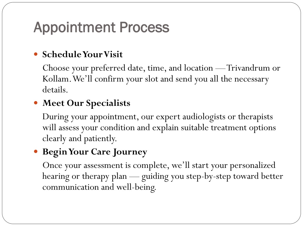 Appointment Process • Schedule Your Visit Choose your preferred date, time, and location — Trivandrum or Kollam. We’ll confirm your slot and send you all the necessary details. • Meet Our Specialists During your appointment, our expert audiologists or therapists will assess your condition and explain suitable treatment options clearly and patiently. • Begin Your Care Journey Once your assessment is complete, we’ll start your personalized hearing or therapy plan — guiding you step-by-step toward better communication and well-being.