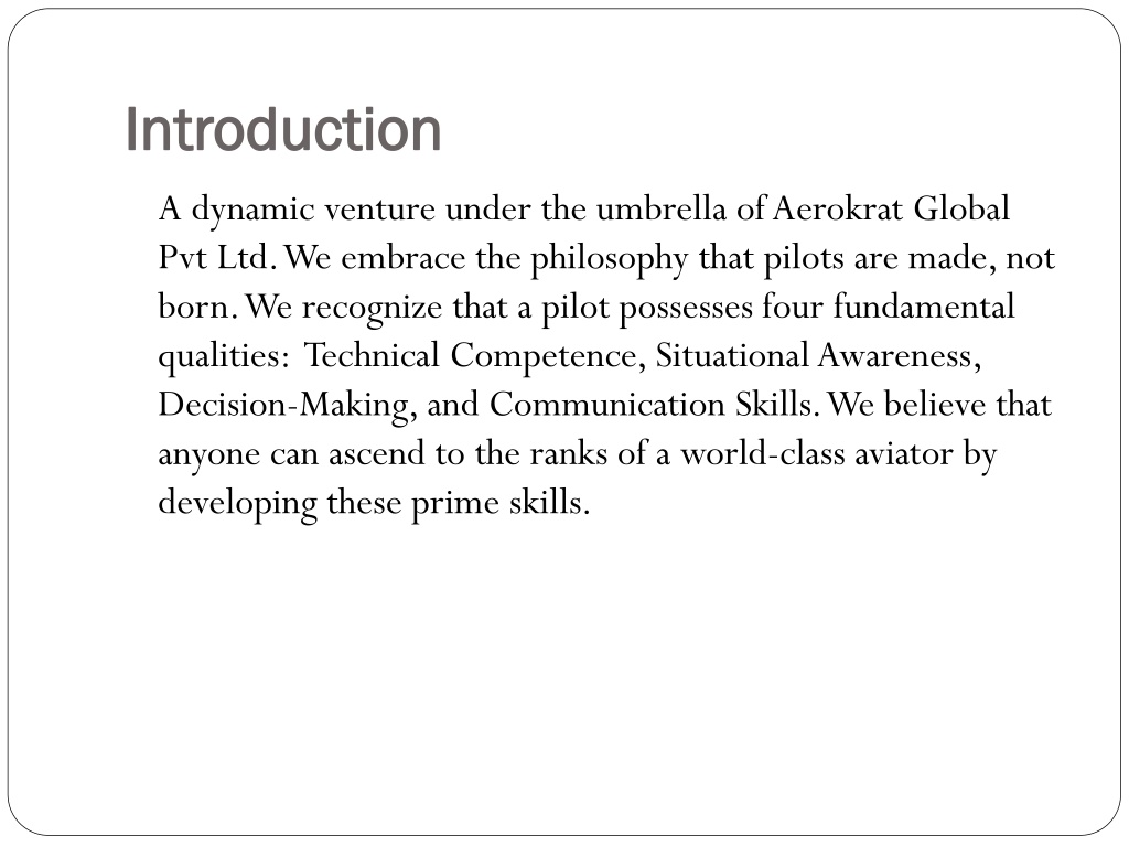 Introduction A dynamic venture under the umbrella of Aerokrat Global Pvt Ltd. We embrace the philosophy that pilots are made, not born. We recognize that a pilot possesses four fundamental qualities: Technical Competence, Situational Awareness, Decision-Making, and Communication Skills. We believe that anyone can ascend to the ranks of a world-class aviator by developing these prime skills.