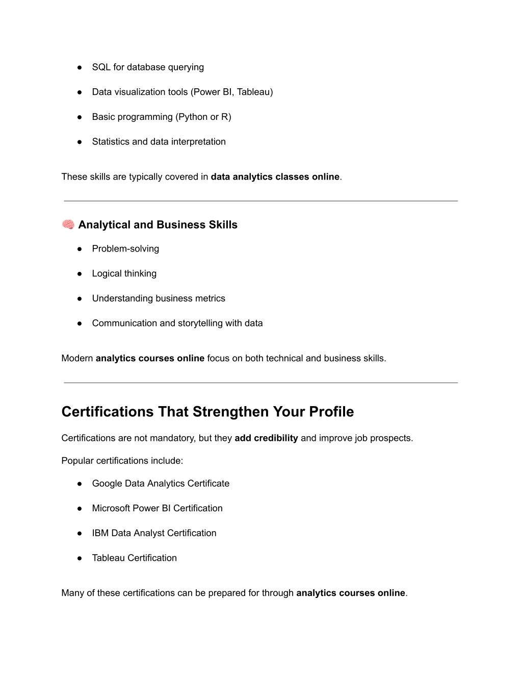 ● SQL for database querying ● Data visualization tools (Power BI, Tableau) ● Basic programming (Python or R) ● Statistics and data interpretation These skills are typically covered in data analytics classes online. ? Analytical and Business Skills ● Problem-solving ● Logical thinking ● Understanding business metrics ● Communication and storytelling with data Modern analytics courses online focus on both technical and business skills. Certifications That Strengthen Your Profile Certifications are not mandatory, but they add credibility and improve job prospects. Popular certifications include: ● Google Data Analytics Certificate ● Microsoft Power BI Certification ● IBM Data Analyst Certification ● Tableau Certification Many of these certifications can be prepared for through analytics courses online.