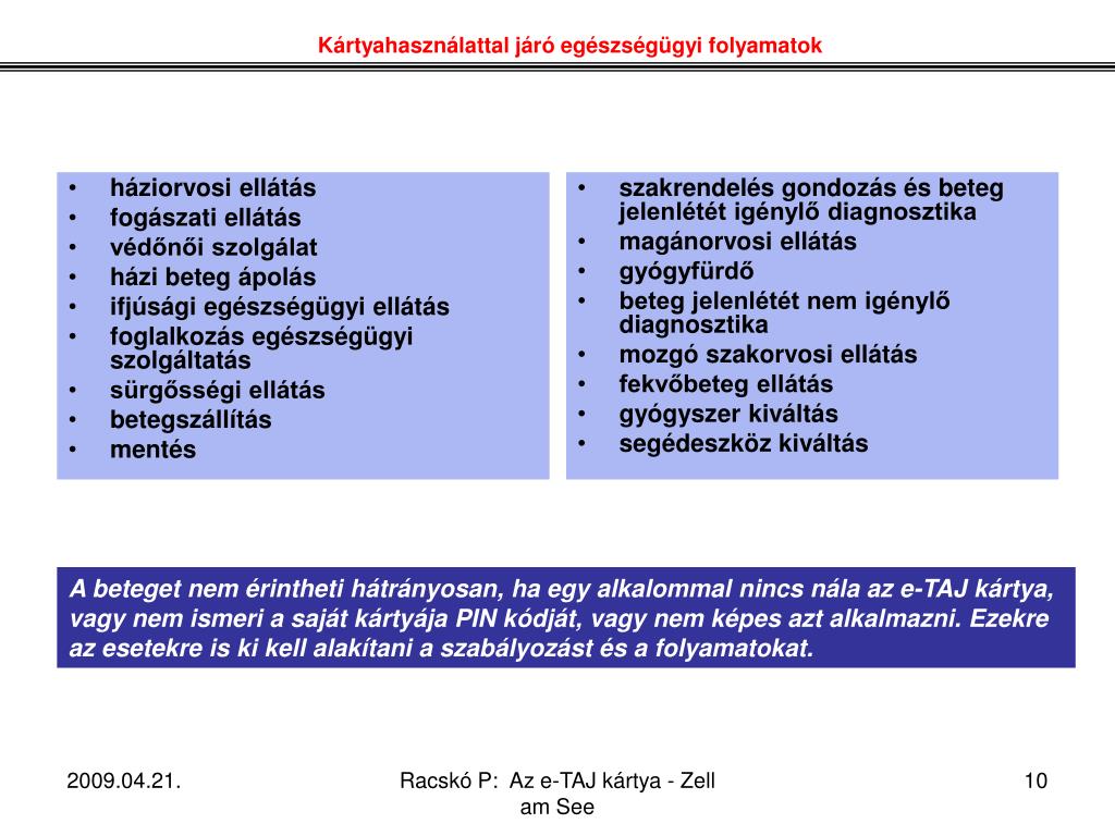 háziorvosi ellátás fogászati ellátás védőnői szolgálat házi beteg ápolás ifjúsági egészségügyi ellátás foglalkozás egészségügyi szolgáltatás sürgősségi ellátás betegszállítás mentés szakrendelés gondozás és beteg jelenlétét igénylő diagnosztika magánorvosi ellátás gyógyfürdő beteg jelenlétét nem igénylő diagnosztika mozgó szakorvosi ellátás fekvőbeteg ellátás gyógyszer kiváltás segédeszköz kiváltás Kártyahasználattal járó egészségügyi folyamatok A beteget nem érintheti hátrányosan, ha egy alkalommal nincs nála az e-TAJ kártya, vagy nem ismeri a saját kártyája PIN kódját, vagy nem képes azt alkalmazni. Ezekre az esetekre is ki kell alakítani a szabályozást és a folyamatokat. Racskó P: Az e-TAJ kártya - Zell am See