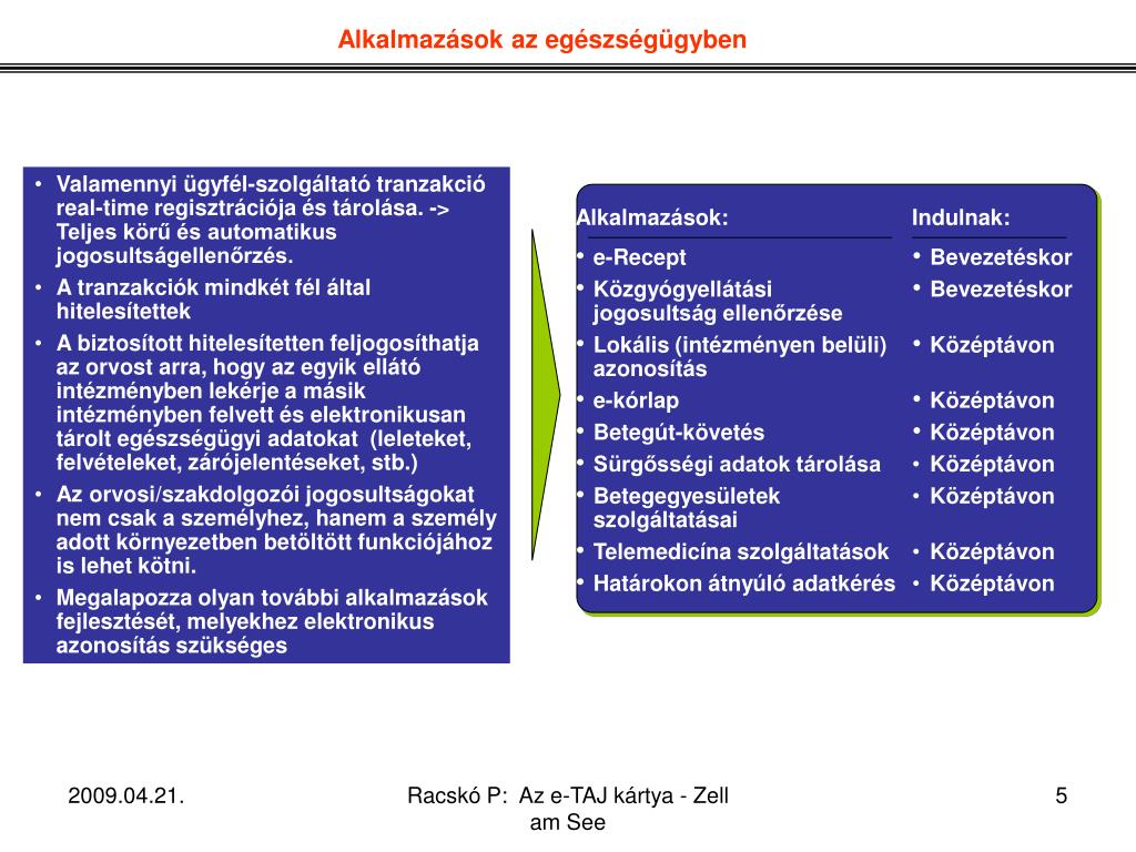 Alkalmazások az egészségügyben • Valamennyi ügyfél-szolgáltató tranzakció real-time regisztrációja és tárolása. -> Teljes körű és automatikus jogosultságellenőrzés. • A tranzakciók mindkét fél által hitelesítettek • A biztosított hitelesítetten feljogosíthatja az orvost arra, hogy az egyik ellátó intézményben lekérje a másik intézményben felvett és elektronikusan tárolt egészségügyi adatokat (leleteket, felvételeket, zárójelentéseket, stb.) • Az orvosi/szakdolgozói jogosultságokat nem csak a személyhez, hanem a személy adott környezetben betöltött funkciójához is lehet kötni. • Megalapozza olyan további alkalmazások fejlesztését, melyekhez elektronikus azonosítás szükséges • Alkalmazások: • e-Recept • Közgyógyellátási jogosultság ellenőrzése • Lokális (intézményen belüli) azonosítás • e-kórlap • Betegút-követés • Sürgősségi adatok tárolása • Betegegyesületek szolgáltatásai • Telemedicína szolgáltatások • Határokon átnyúló adatkérés • Indulnak: • Bevezetéskor • Bevezetéskor • Középtávon • Középtávon • Középtávon • Középtávon • Középtávon • Középtávon • Középtávon Racskó P: Az e-TAJ kártya - Zell am See