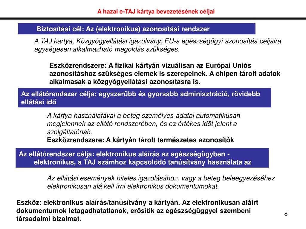 A hazai e-TAJ kártya bevezetésének céljai • Biztosítási cél: Az (elektronikus) azonosítási rendszer egységesítése • A TAJ kártya, Közgyógyellátási igazolvány, EU-s egészségügyi azonosítás céljaira egységesen alkalmazható megoldás szükséges. • Eszközrendszere: A fizikai kártyán vizuálisan az Európai Uniós azonosításhoz szükséges elemek is szerepelnek. A chipen tárolt adatok alkalmasak a közgyógyellátási azonosításra is. Az ellátórendszer célja: egyszerűbb és gyorsabb adminisztráció, rövidebb ellátási idő • A kártya használatával a beteg személyes adatai automatikusan megjelennek az ellátó rendszerében, és ez értékes időt jelent a szolgáltatónak. • Eszközrendszere: A kártyán tárolt természetes azonosítók • Az ellátórendszer célja: elektronikus aláírás az egészségügyben - • elektronikus, a TAJ számhoz kapcsolódó tanúsítvány használata az • Az ellátási események hiteles igazolásához, vagy a beteg beleegyezéséhez elektronikusan alá kell írni elektronikus dokumentumokat. • Eszköz: elektronikus aláírás/tanúsítvány a kártyán. Az elektronikusan aláírt dokumentumok letagadhatatlanok, erősítik az egészségüggyel szembeni társadalmi bizalmat.